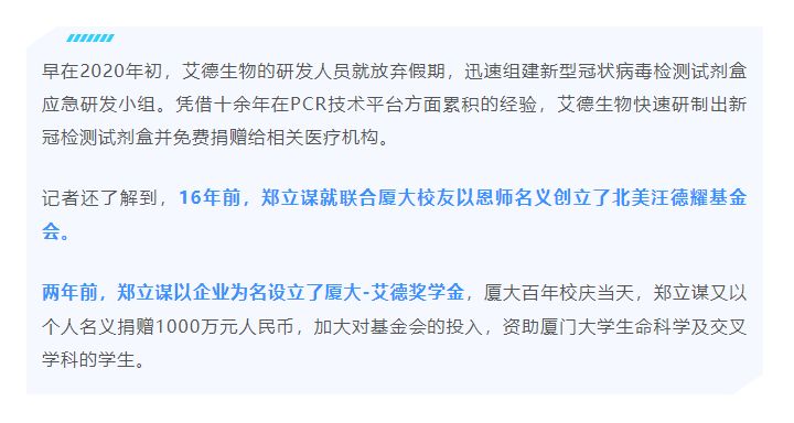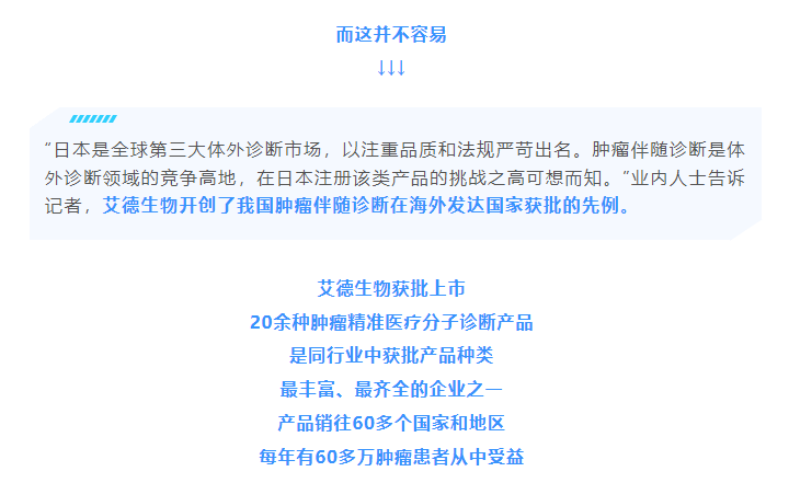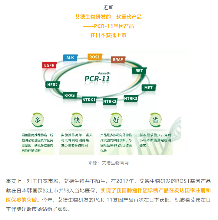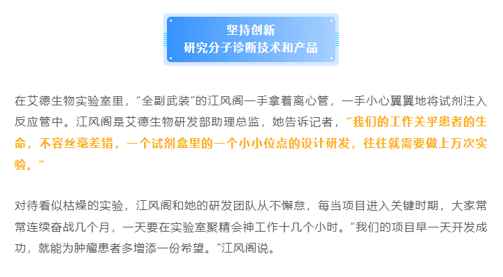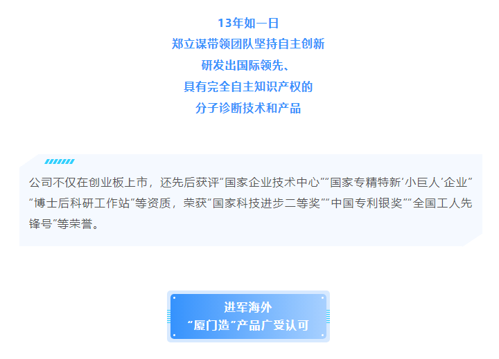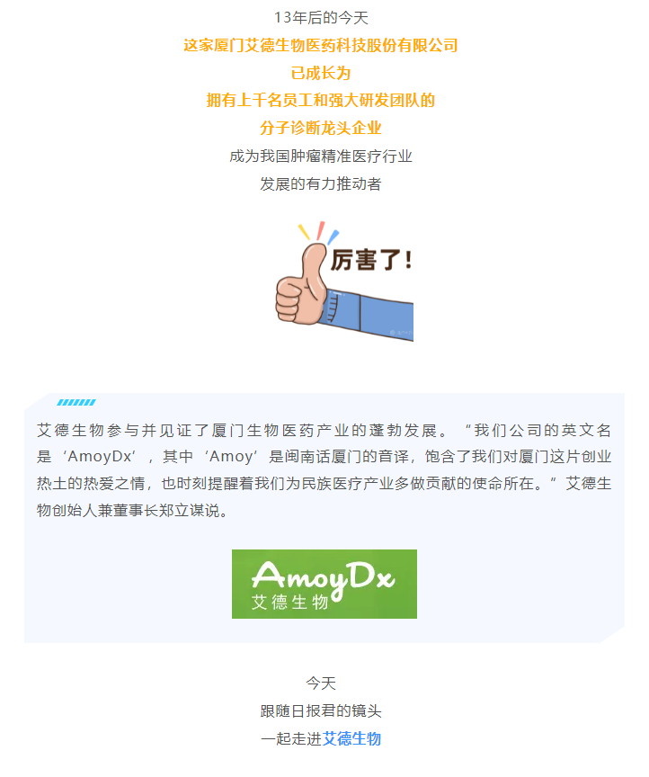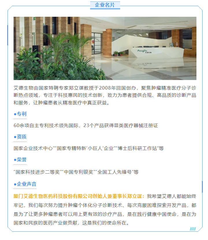 廈門艾德生物醫(yī)藥科技股份有限公司(股票代碼:300685)聚焦在腫瘤精準(zhǔn)醫(yī)療分子診斷領(lǐng)域,專注于科技惠民的技術(shù)創(chuàng)新,致力為患者提供合規(guī)、高品質(zhì)的診斷產(chǎn)品和服務(wù),讓患者從精準(zhǔn)醫(yī)療中真正獲益。公司擁有國家企業(yè)技術(shù)中心、工信部專精特新小巨人企業(yè)、國家級制造業(yè)單項(xiàng)冠軍企業(yè)、博士后科研工作站、發(fā)改委基因檢測技術(shù)應(yīng)用示范中心、國家高新技術(shù)企業(yè)、福建省腫瘤高通量測序工程研究中心等資質(zhì),GMP標(biāo)準(zhǔn)廠房獲得國家藥監(jiān)局(NMPA)和歐盟ISO13485資質(zhì)認(rèn)證;公司擁有ADx-ARMS?、Super-ARMS?、ddCapture?、ADx-HANDLE?等核心技術(shù),核心技術(shù)獲得中國、美國、歐盟、日本授權(quán),榮獲國家科學(xué)技術(shù)進(jìn)步獎二等獎、中國專利獎銀獎;公司產(chǎn)品覆蓋具備精準(zhǔn)醫(yī)療條件的各大癌種,多個產(chǎn)品至今尚無競品,除了在國內(nèi)三甲醫(yī)院大規(guī)模應(yīng)用外,部分產(chǎn)品在日本、韓國獲批上市并進(jìn)入當(dāng)?shù)蒯t(yī)保,開創(chuàng)了我國腫瘤伴隨診斷海外獲批的先例。此外,公司下設(shè)廈門艾德醫(yī)學(xué)檢驗(yàn)所、上海廈維醫(yī)學(xué)檢驗(yàn)所,擁有醫(yī)療機(jī)構(gòu)執(zhí)業(yè)許可證、通過美國病理學(xué)會(CAP)認(rèn)證和ISO15189認(rèn)可,專業(yè)從事第三方臨檢服務(wù)。目前全球數(shù)十個國家和地區(qū)的客戶選擇了艾德產(chǎn)品和服務(wù),每年有數(shù)十萬腫瘤患者從中受益。此外,公司瞄準(zhǔn)行業(yè)創(chuàng)新源頭,以伴隨診斷賦能原研藥物臨床,是眾多頂級藥企腫瘤藥物開發(fā)的戰(zhàn)略合作伙伴,是國際知名的民族品牌。