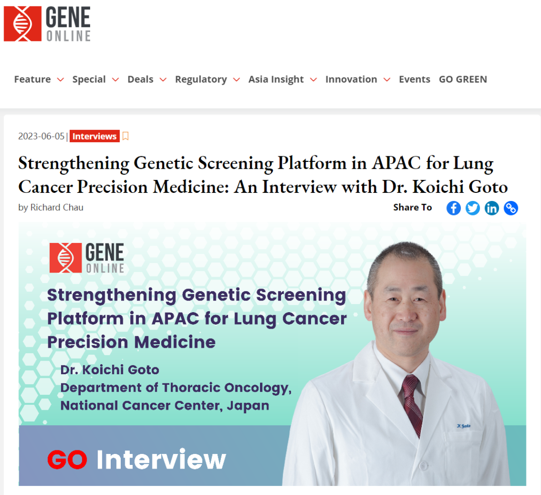 6月5日,國(guó)際頂尖肺癌專(zhuān)家、亞洲肺癌基因組篩查項(xiàng)目(LC-SCRUM-Asia,由日本國(guó)家癌癥研究中心發(fā)起,日本200多家醫(yī)院及制藥、診斷企業(yè)共同參與的LC-SCRUM-Asia癌癥靶標(biāo)篩查項(xiàng)目)負(fù)責(zé)人Koichi Goto教授,在接受?chē)?guó)際行業(yè)權(quán)威媒體GeneOnline采訪中強(qiáng)調(diào):
