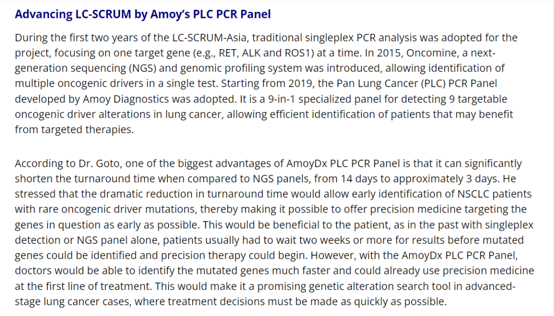 “與NGS方法相比,艾德生物PCR-11基因最大的優(yōu)勢(shì)是,可以將檢測(cè)周期從NGS產(chǎn)品的14天縮短到僅需3天。他強(qiáng)調(diào),這種檢測(cè)周期的大幅縮短令人矚目,將使攜帶罕見(jiàn)突變的非小細(xì)胞肺癌患者盡早接受治療。相比NGS檢測(cè),患者通常需要等待兩周或更長(zhǎng)時(shí)間才能獲得基因突變的檢測(cè)結(jié)果,之后再實(shí)施個(gè)性化治療。使用艾德生物PCR-11基因,醫(yī)生可以更快地確定這些基因突變,并在病情較輕時(shí)進(jìn)行個(gè)性化治療。對(duì)需要迅速給出治療決策的晚期肺癌患者,該產(chǎn)品無(wú)疑是實(shí)用性很高的檢測(cè)工具,艾德生物PCR-11基因?qū)Ψ伟┚珳?zhǔn)診療的進(jìn)步做出了重要貢獻(xiàn)。Goto教授補(bǔ)充道,從臨床的角度來(lái)看,目前只有9個(gè)基因(NTRK1/2/3簡(jiǎn)稱(chēng)NTRK基因)有對(duì)應(yīng)的靶向藥物。盡管通過(guò)NGS可以檢測(cè)數(shù)百種基因突變,但絕大多數(shù)結(jié)果無(wú)法用于指導(dǎo)治療。”