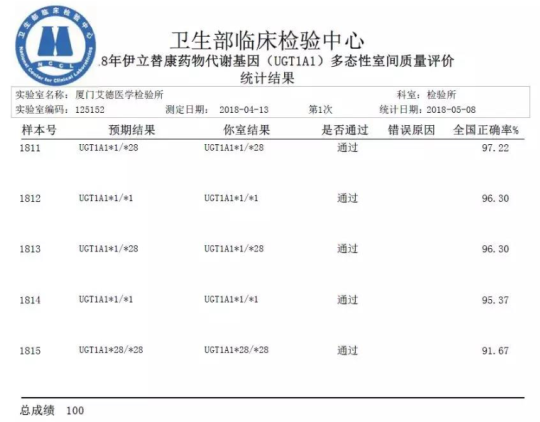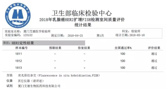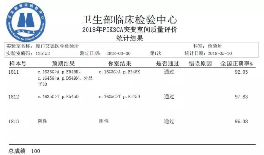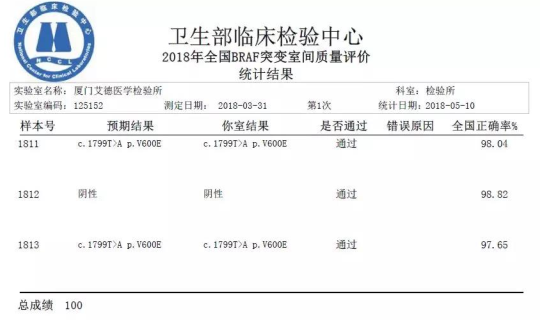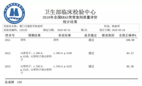 2018年5月,廈門(mén)艾德醫(yī)學(xué)檢驗(yàn)所再次以7個(gè)項(xiàng)目全滿分通過(guò)了由衛(wèi)生部臨床檢驗(yàn)中心(NCCL)組織的2018年上半年(第一輪)全國(guó)臨床檢驗(yàn)實(shí)驗(yàn)室質(zhì)量評(píng)價(jià),彰顯艾德生物恪守規(guī)范、精益求精的品質(zhì)追求!自成立以來(lái),艾德醫(yī)學(xué)檢驗(yàn)所連續(xù)多年積極參加國(guó)內(nèi)外各權(quán)威機(jī)構(gòu)組織的各項(xiàng)室間質(zhì)評(píng)及能力驗(yàn)證項(xiàng)目,以滿分的佳績(jī)證明其在腫瘤分子診斷上的硬實(shí)力!