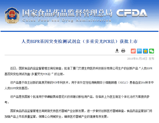 2018年1月19日,中國食品藥品監(jiān)督管理總局(CFDA)通過創(chuàng)新醫(yī)療器械特別審批通道,批準(zhǔn)艾德生物的Super-ARMS®EGFR基因突變檢測試劑盒,用于臨床檢測晚期非小細(xì)胞肺癌(NSCLC)患者血液ctDNA中EGFR基因突變狀態(tài),篩選適合接受一代至三代EGFR靶向藥物治療的患者。這個(gè)以伴隨診斷試劑標(biāo)準(zhǔn)獲批上市的ctDNA檢測試劑盒,將開啟腫瘤液體活檢的新里程!