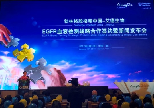 中國廈門,2017年1月10日 - 總部位于廈門的腫瘤精準檢測領(lǐng)域優(yōu)勢企業(yè)艾德生物與全球先進的制藥公司勃林格殷格翰今日共同宣布:雙方簽署了一項合作協(xié)議,啟動艾德生物-勃林格殷格翰肺癌EGFR突變血液檢測項目。該項目將致力于非小細胞肺癌EGFR突變血液檢測在中國大陸的推廣,實現(xiàn)一管血檢測非小細胞肺癌患者EGFR基因突變狀態(tài),讓更多非小細胞肺癌患者都有機會從EGFR靶向藥物治療中受益。肺癌血液EGFR突變檢測項目中將采用艾德生物新創(chuàng)的、專門為血液基因突變檢測而開發(fā)的高敏感檢測技術(shù)ADx-Super-ARMS®。